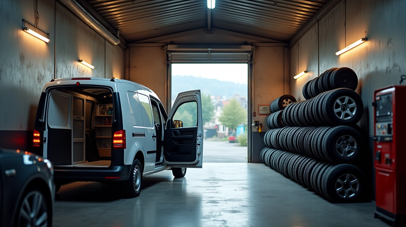 A technician arrives in a branded van, equipped with lifts, compressors, balancing machines, and a range of tyres for different brands and specifications. On request, they can dispose of old tyres responsibly.